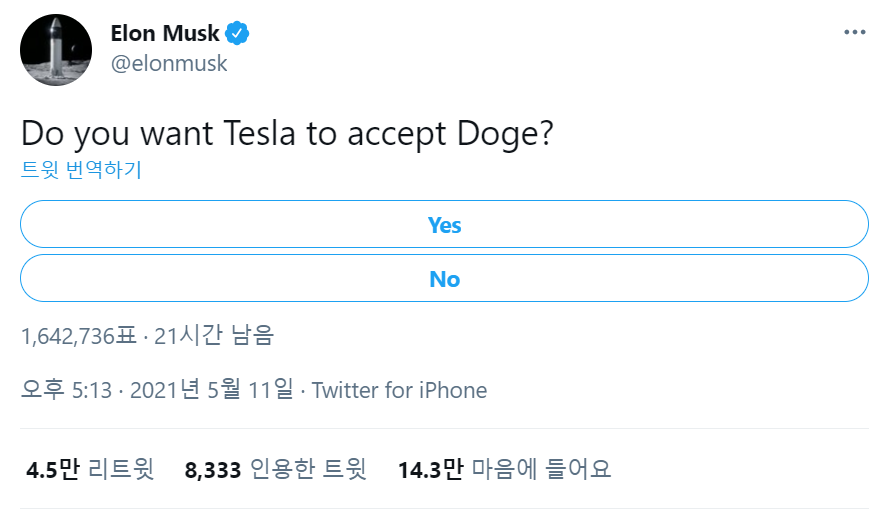 오늘 아래 트윗 하나가 또 도지코인의 시세를 들썩이게 했습니다. 일각에서는 "알런머스크가 이정도면 관종이 아니냐"