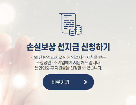 강화된 방역조치로 인해 영업시간 제한을 받는 소상공인, 소기업에게 지원된다는 이 손실보상 선지급 신청은 본인인증후 지원금을 신청할 수 있습니다. 만약 손실보상금을 신청하신 경우에는 신청결과를 확인하실 수도 있는 점 기억해두시기 바랍니다.